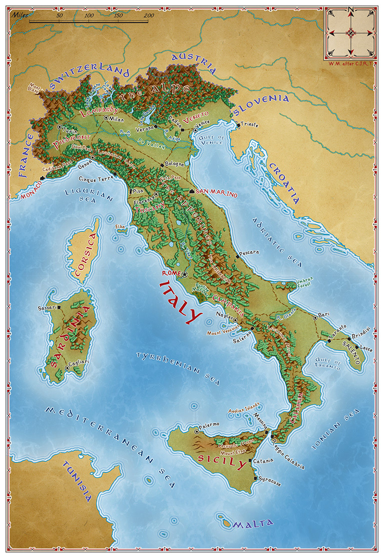 Full-colour map evoking the style of the Middle-earth maps drawn by J.R.R. Tolkien's son Christopher Tolkien for the Lord of the Rings.