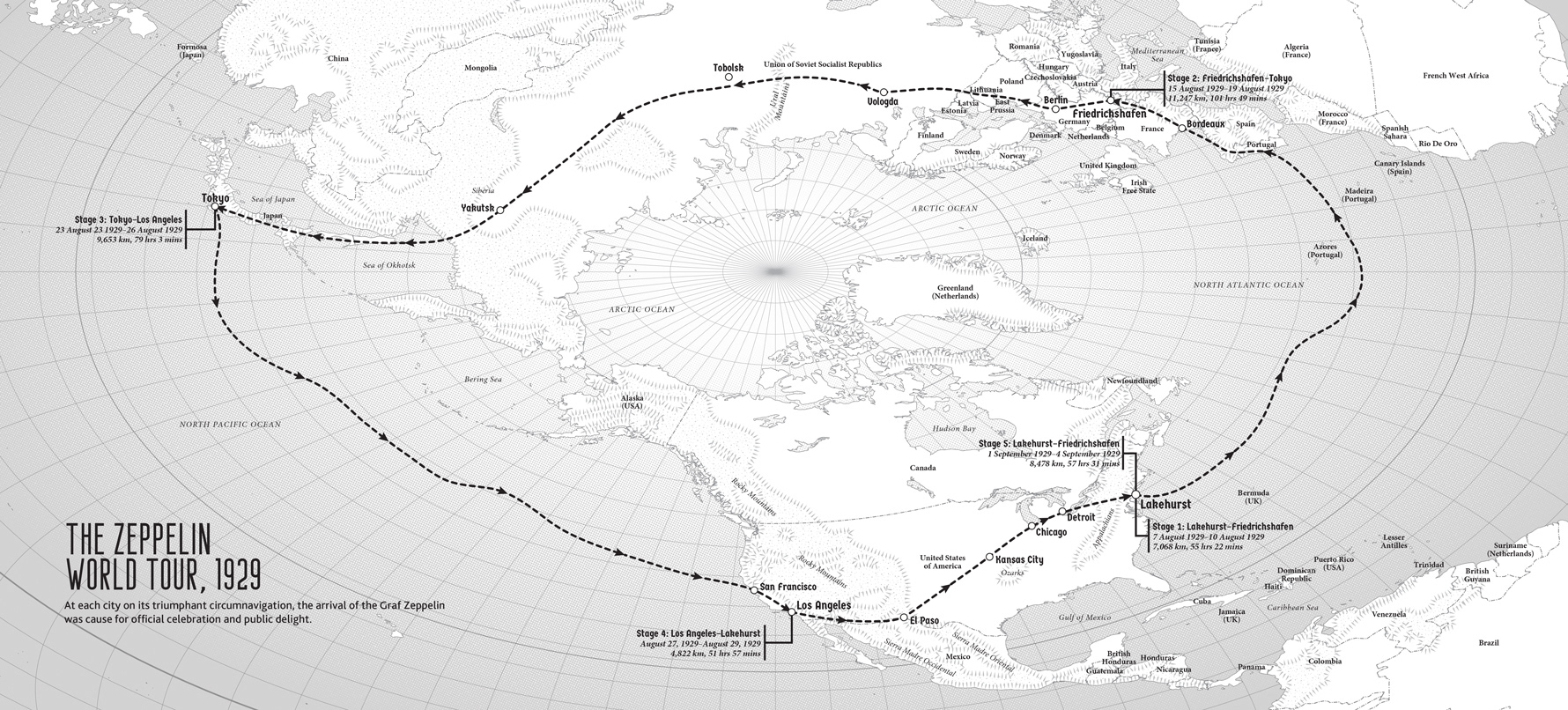 Double-page spread map designed to evoke half-toned newspaper maps of the 1920s, depicting the circumnavigation of the globe by the Graf Zeppelin dirigible in 1929