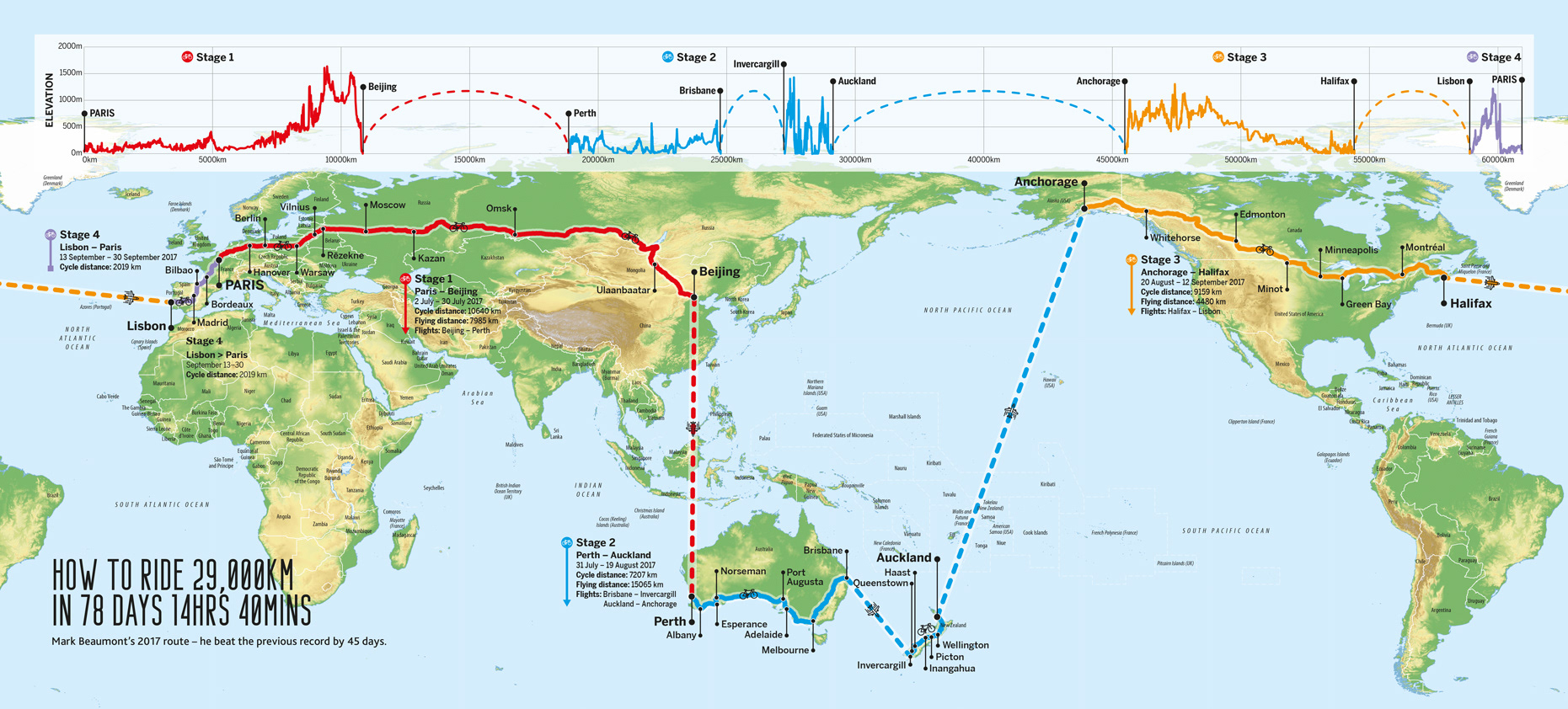 Double-page spread map with an elevation chart designed as if appearing in a bicycle enthusiast magazine, depicting the circumnavigation of the globe by Mark Beaumont in 2017