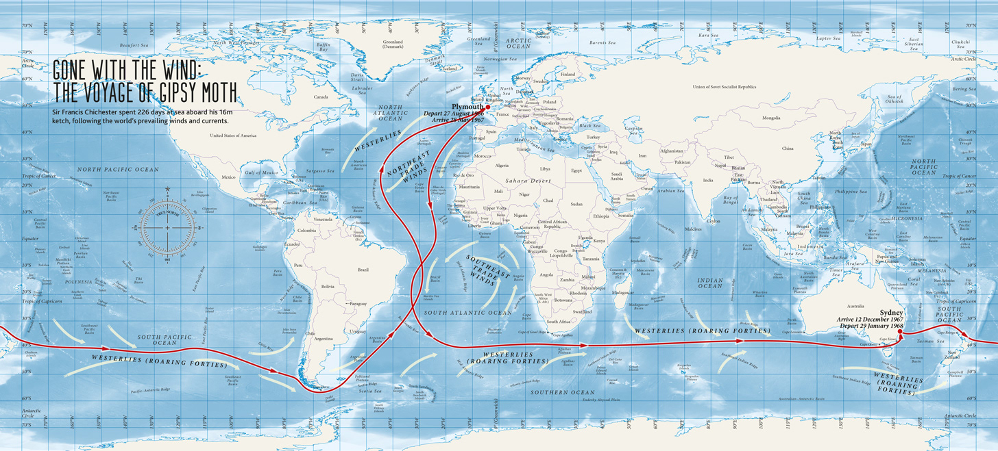 Double-page spread map designed to evoke a navigational chart, depicting the circumnavigation of the globe by Sir Francis Chichester in 1966-7