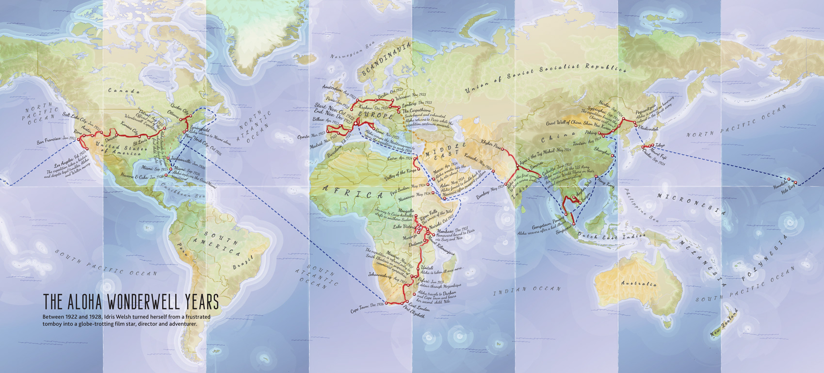 Double-page spread map designed to evoke a folded car touring map, depicting the circumnavigation of the globe by Aloha Wonderwell (Idris Welsh) and her companions between 1922 and 1928.