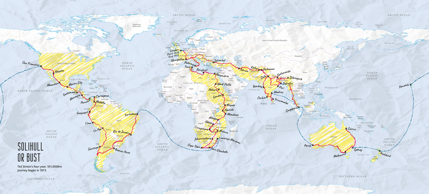 Double-page spread map designed to evoke a crumpled map with hand-drawn annotations, depicting the motorcycle circumnavigation of the globe by Ted Simon in 1973-77