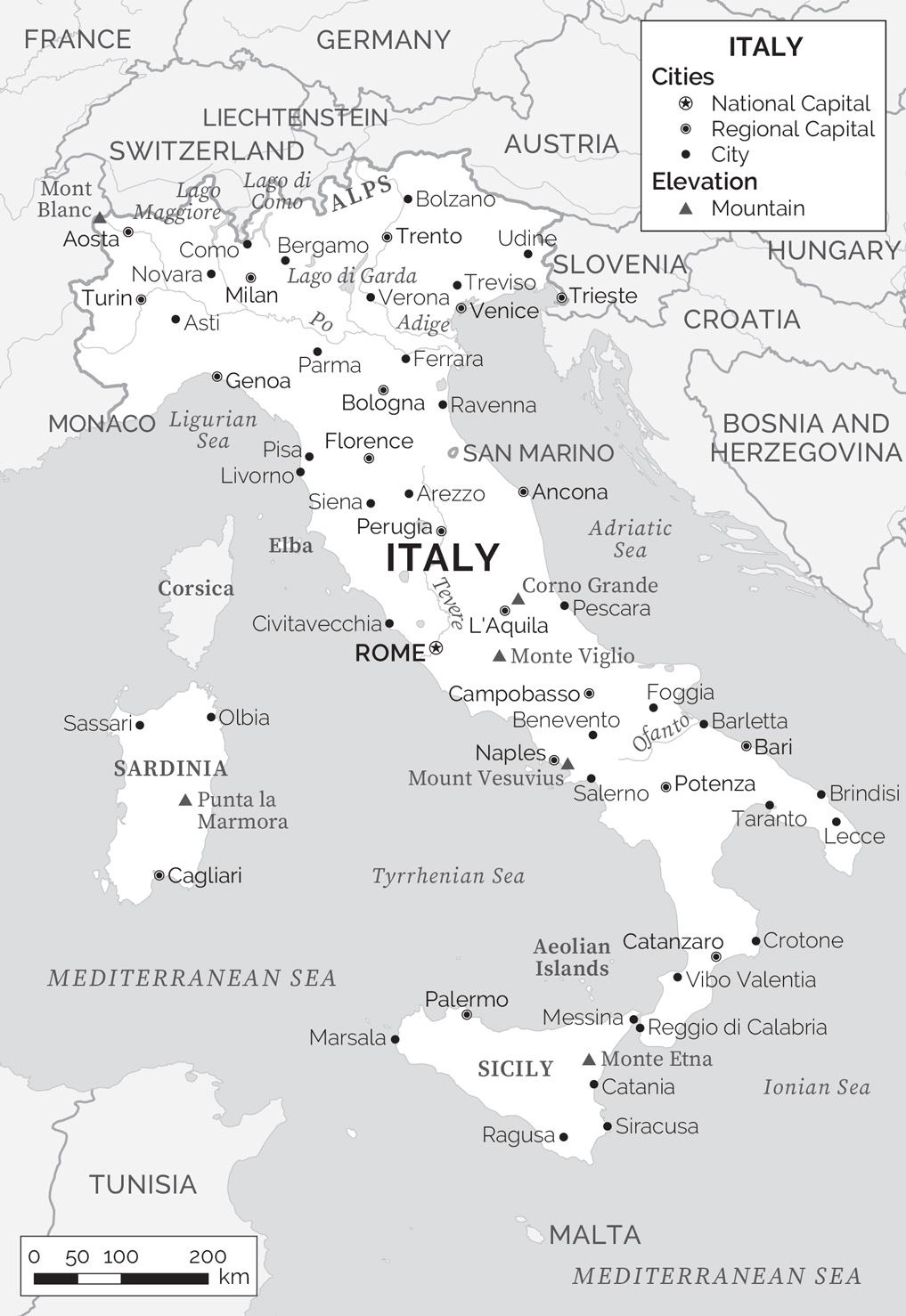 Simple black & white map with cities, rivers and political features