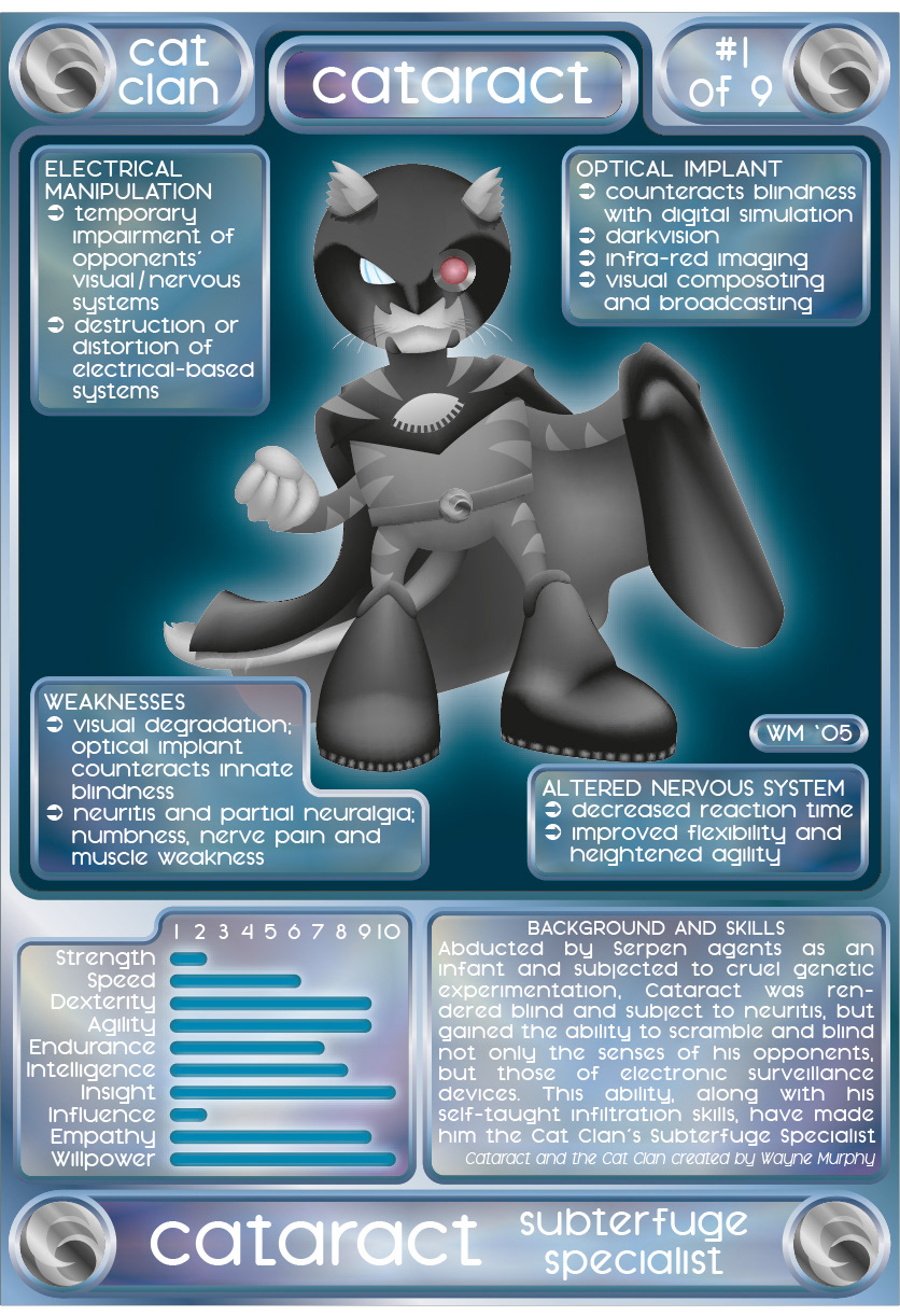 Cataract character card created as part of the development of the Cat Clan comic; created with Adobe Illustrator