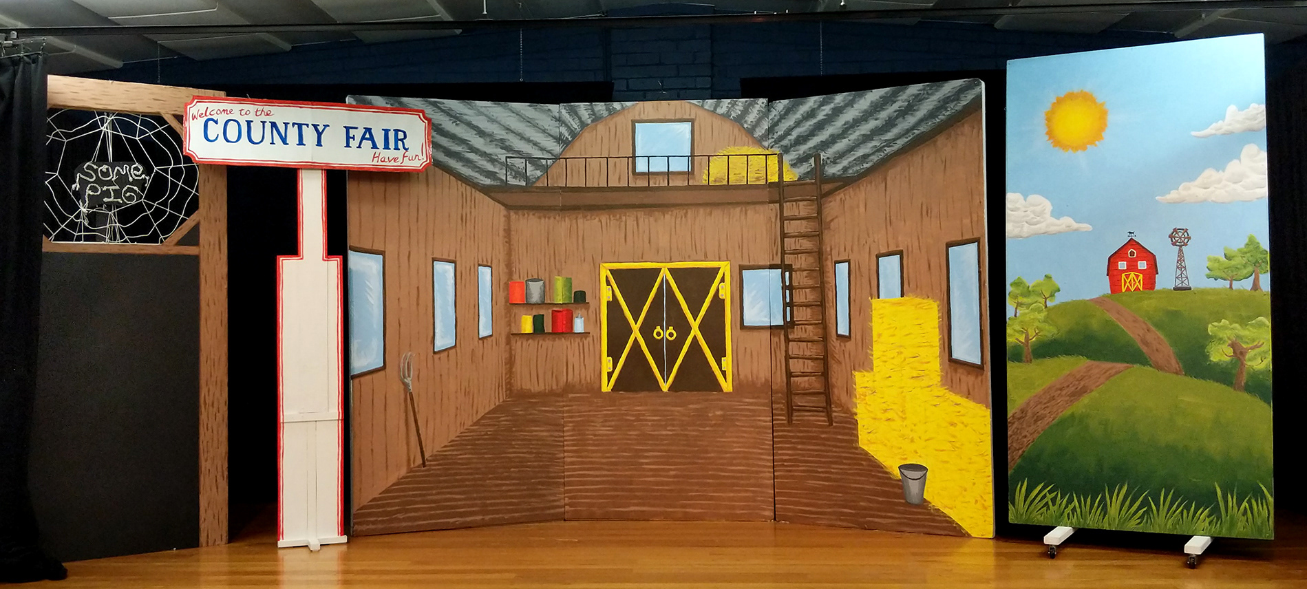 Stage dressing for Charlotte's Web childrens pantomime by Powderkeg Players, acrylics on five 2.5x1.25m plasterboard flats