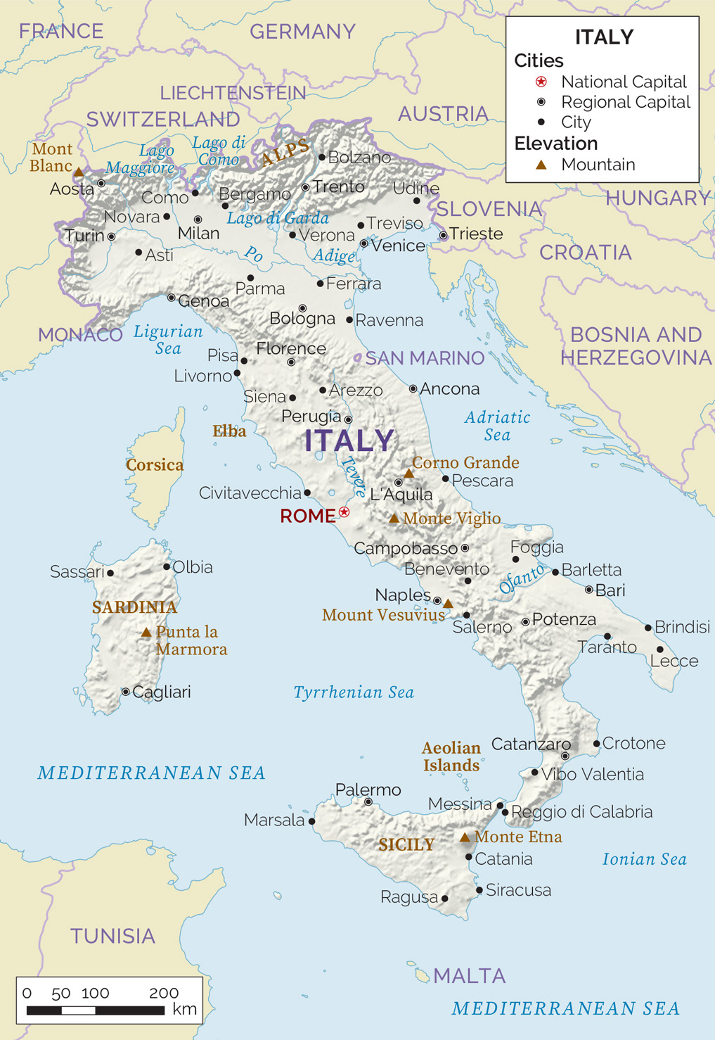 Colour map with relief shading, cities, rivers and political features