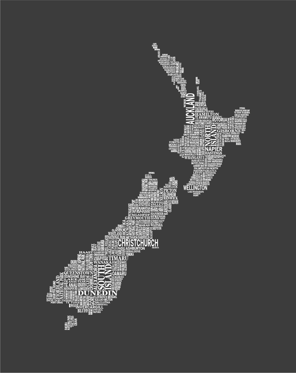 New Zealand word art map created for Cartotastic on Redbubble; created with Adobe Illustrator