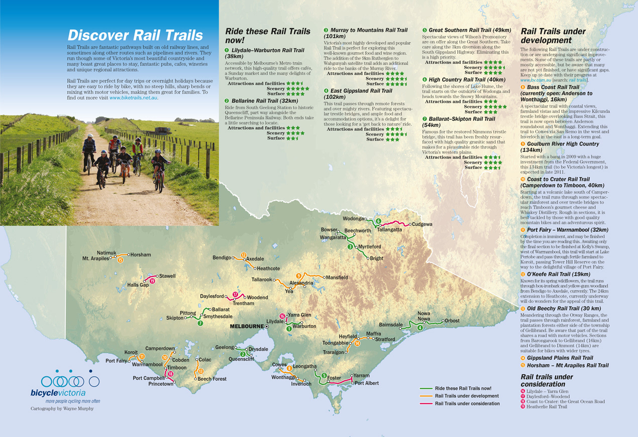 Double-page map spread showing the location of rail trails in Victoria for Bicycle Victoria's Ride On magazine